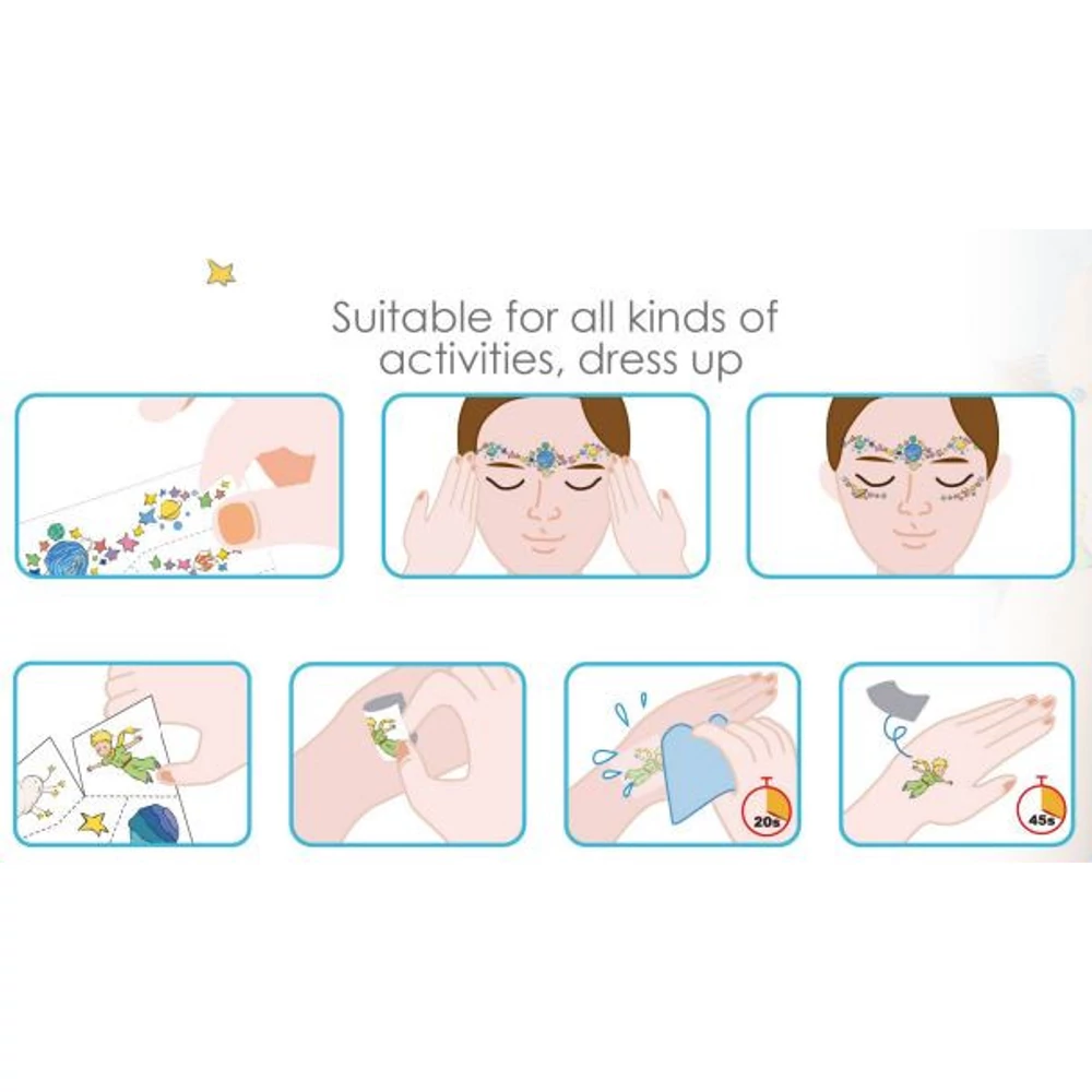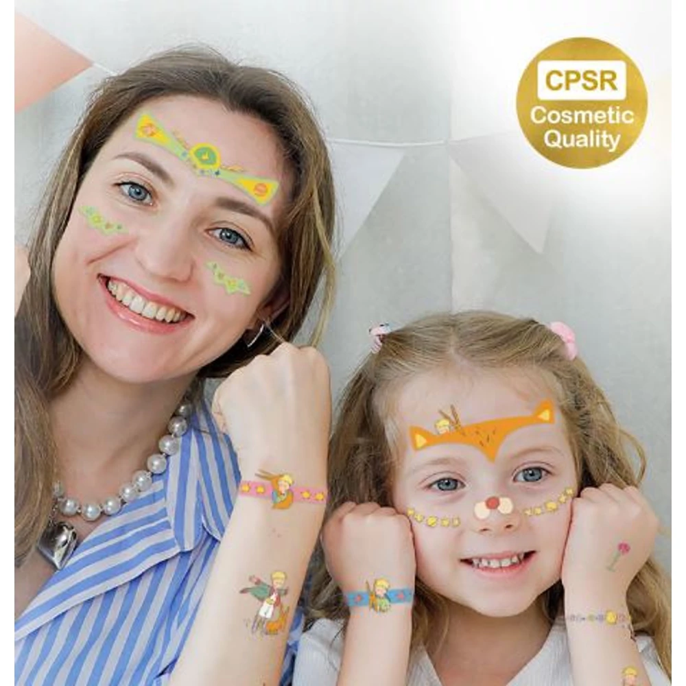 Szereted A kis herceg mesét? Akkor ezt a készletet neked találták ki! Az arcmatricák és tetoválások gondoskodnak arról, hogy kedvenc motívumaid megelevenedjenek a bőrödön! A készletben ráadásul nagyobb méretű arcmatricák is találhatók, így akár bevonhatod anyát vagy apát, esetleg a testvéredet is a játékba.