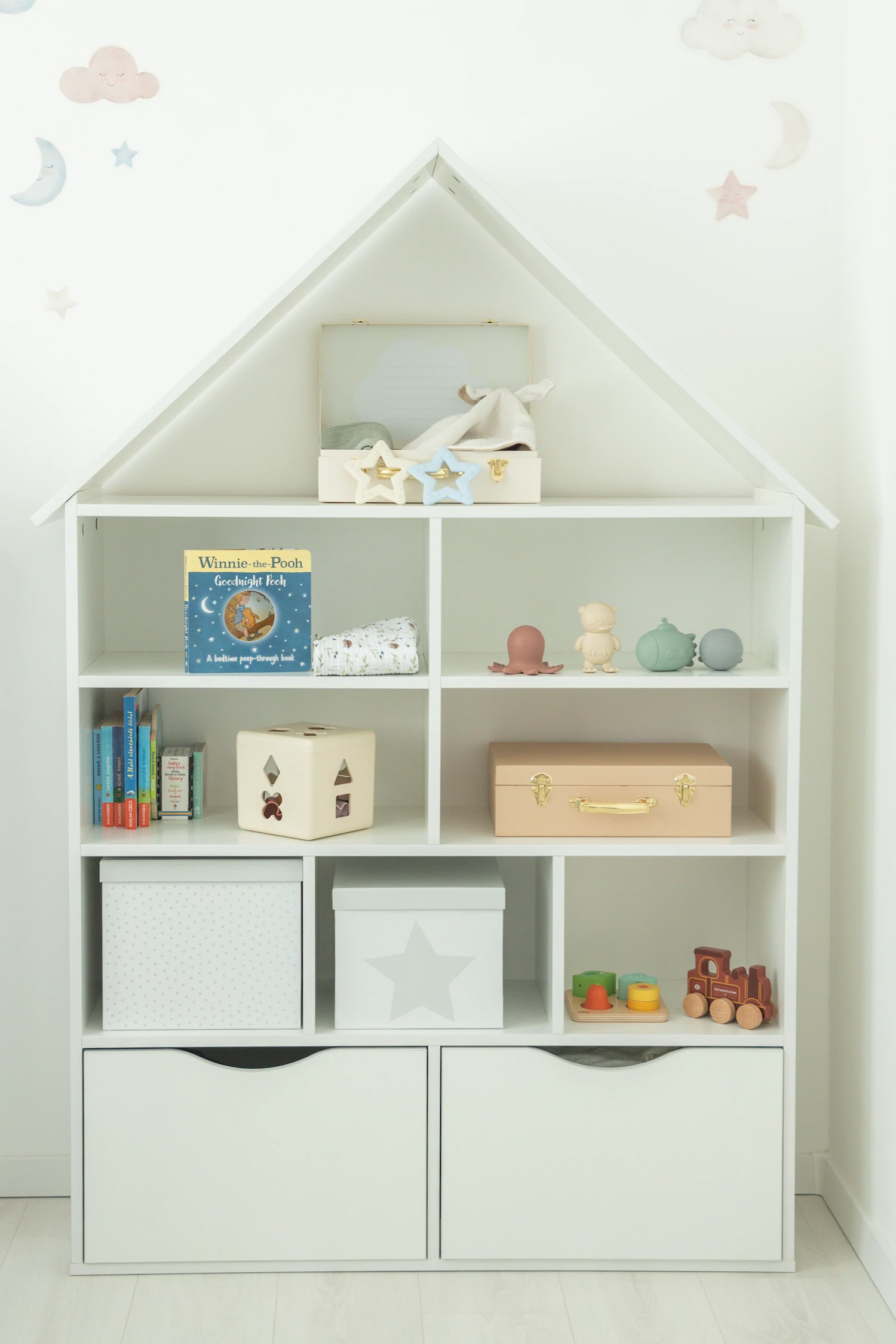 A polcokon dobozokban vagy kosarakban is tárolhatod a játékokat.